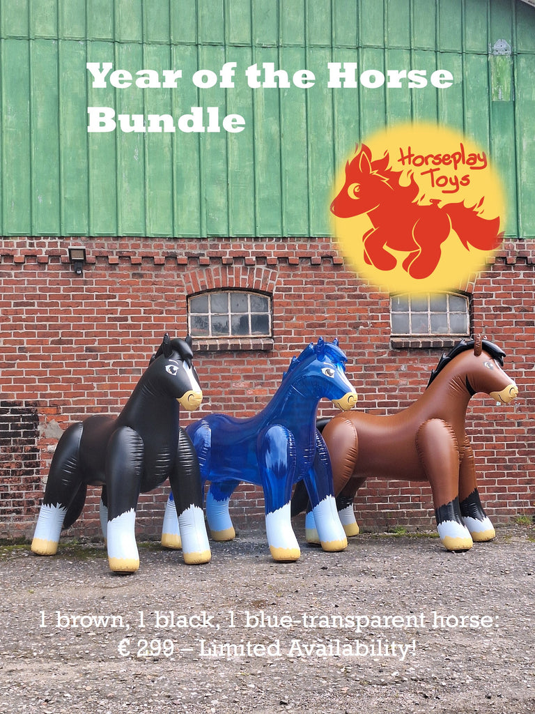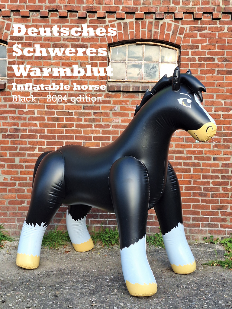 Get all 3 of the latest, original, edition of our iconic Heavy German Warmblood designed by Arin. The inflatable that started it all for us in 2015! This friendly horse is 215cm (87 inches) long and a great prop for any party or event.